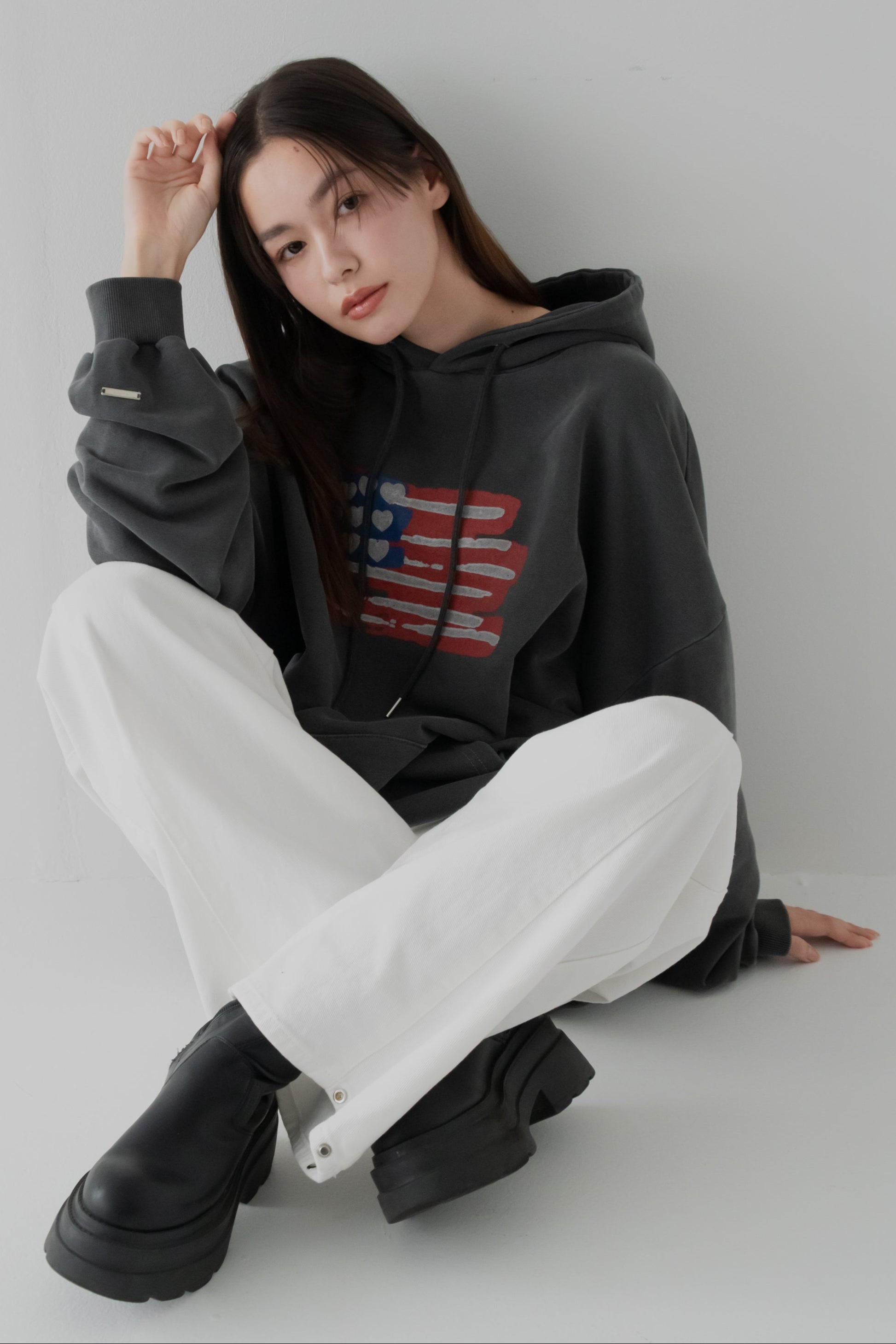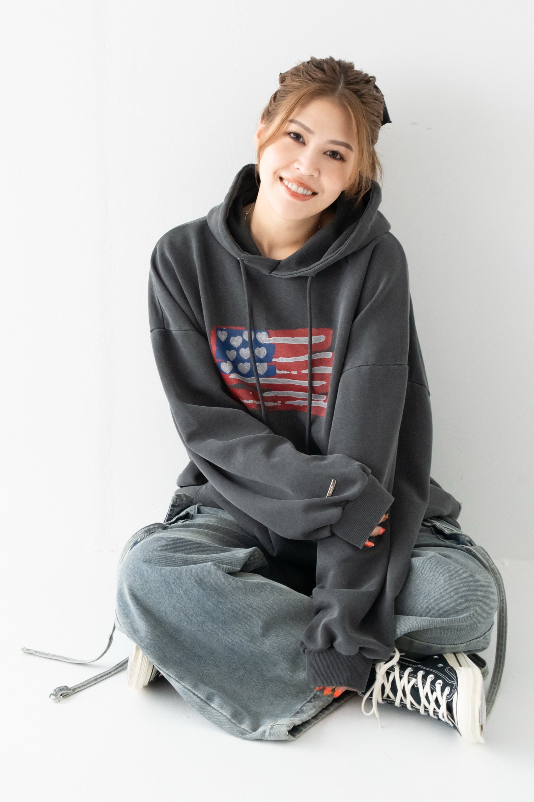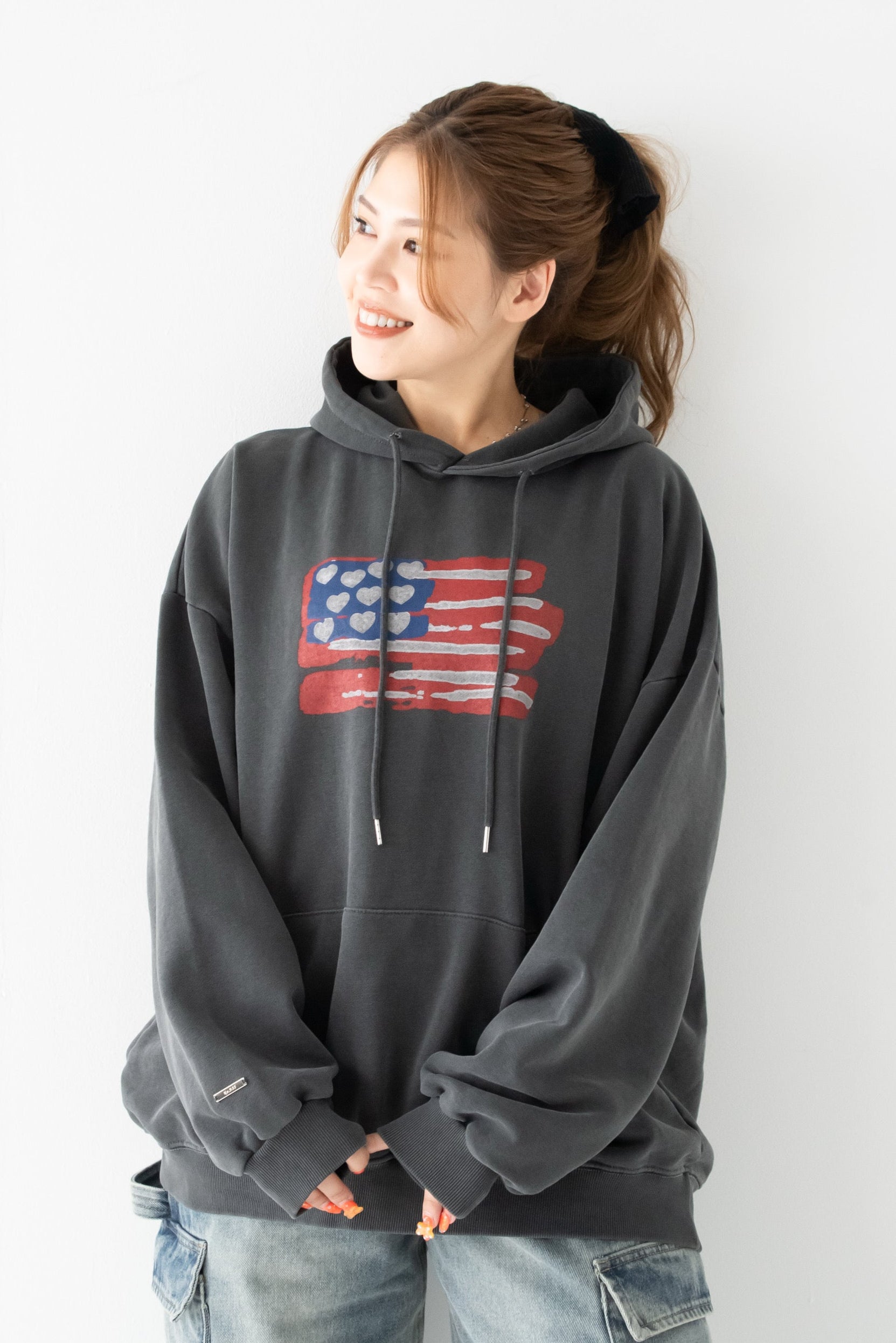くぅちゃんバッジは袖にON!ヴィンテージ感あふれるフーディー。